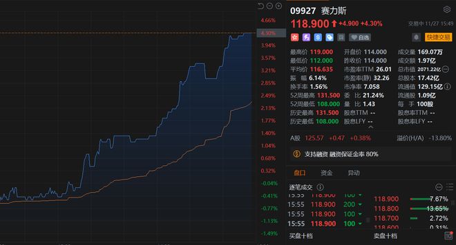 根据香港联交所最新披露的文件,China International Capital Corporation Limited于11月24日以每股均价 110.981港元增持$赛力斯56.5万股H股股份,价值约6,270.43万港元。增持后,该股东最新持股数目为 2,617.15万股股份,好仓比例由23.57%升至24.09%。 赛力斯(9927.HK)午后持续上涨,尾盘涨至4.3%报118.9港元,总市值2071亿港元。 赛力斯本月初港交所主板挂牌,以140.16 亿港元净募资刷新中国车企IPO纪录,并获22家基石机构超 1700亿港元热捧,以"A+H"双资本平台赋能全球化新征程。 ...