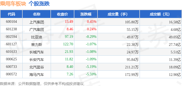 证券之星消息,1月13日乘用车板块较上一交易日下跌0.71%,海马汽车领跌。当日上证指数报收于 4138.76,下跌0.64%。深证成指报收于14169.4,下跌1.37%。乘用车板块个股涨跌见下表: | 代码 | 名称 | 收盘价 | 涨跌幅 | 成交量(手) | 成交额(元) | | --- | --- | --- | --- | --- | --- | | 600104 | 上汽集团 | 15.49 | 0.45% | 105.80万 | 16.58亿 | | 601238 | 广汽集团 | 8.46 | 0.24% | 55.15万 | 4.68亿 | | 002594 | 比亚迪 | 97.19 | -0.29% | 49.87万 | 49.05 Z | | 601127 | 審力斯 | 122.70 | -1.07% | - 22.38万 | 27.74亿 | | 601633 | 长城汽车 | 21.93 | -1.08% | 24.97万 | 5.51亿 | | 000625 | 长安汽车 | 11.82 | -1.09% | 95.84万 | 11.39亿 | | 600733 | 北汽蓝谷 ...