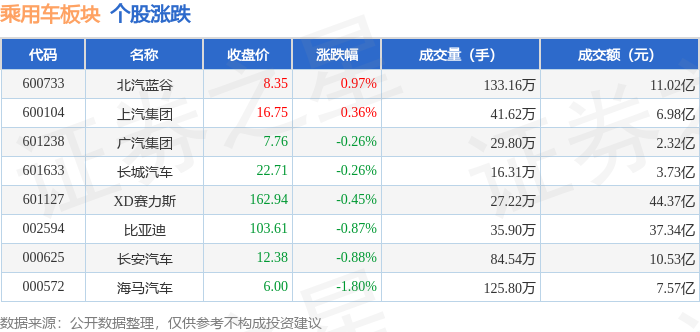 Market Overview - The passenger car sector experienced a decline of 0.46% on October 30, with Haima Automobile leading the drop [1] - The Shanghai Composite Index closed at 3986.9, down 0.73%, while the Shenzhen Component Index closed at 13532.13, down 1.16% [1] Individual Stock Performance - Beiqi Blue Valley (600733) closed at 8.35, down 0.97% with a trading volume of 1.33 million shares and a turnover of 1.1 billion [1] - SAIC Motor (600104) saw a slight increase of 0.36%, closing at 16.75 with a trading volume of 416,200 shares [1] - GAC Group (601238) closed at 7.76, down 0.26% with a trading volume of 298,000 shares [1] - Great Wall Motors (601633) closed at 22.71, down 0.26% with a trading volume of 163,100 shares [1] - XD Seres (601127) closed at 162.94, down 0.45% with a trading volume of 272,200 shares [1] - BYD (002594) closed at 103.61, down 0.87% with a trading volume of 359,000 shares [1] - Changan Automobile (000625) closed at 12.38, down 0.88% with a trading volume of 845,400 shares [1] - Chery Automobile (000572) closed at 6.00, down 1.80% with a trading volume of 1.26 million shares [1] Capital Flow Analysis - The passenger car sector saw a net outflow of 713 million yuan from main funds, while retail funds experienced a net inflow of 517 million yuan [1] - The following stocks had notable capital flows: - Beiqi Blue Valley: Main funds net inflow of 82.19 million yuan, retail net inflow of 6.06 million yuan [2] - SAIC Motor: Main funds net inflow of 48.37 million yuan, retail net outflow of 37.73 million yuan [2] - GAC Group: Main funds net inflow of 3.47 million yuan, retail net inflow of 1.92 million yuan [2] - Great Wall Motors: Main funds net outflow of 4.58 million yuan, retail net outflow of 1.58 million yuan [2] - Chery Automobile: Main funds net outflow of 71.47 million yuan, retail net inflow of 64.56 million yuan [2] - Changan Automobile: Main funds net outflow of 128 million yuan, retail net inflow of 1.33 million yuan [2] - XD Seres: Main funds net outflow of 230 million yuan, retail net inflow of 91.61 million yuan [2] - BYD: Main funds net outflow of 413 million yuan, retail net inflow of 26 million yuan [2]