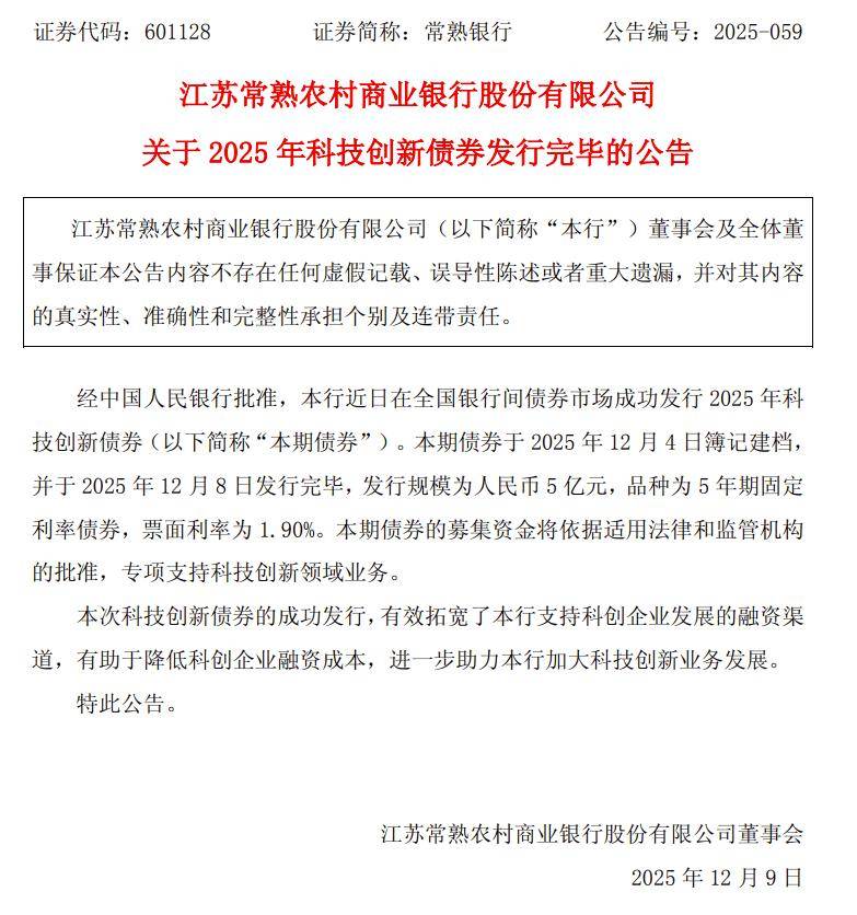 经中国人民银行批准,本行近日在全国银行间债券市场成功发行 2025 年科 技创新债券(以下简称"本期债券")。本期债券于 2025 年 12 月 4 日簿记建档, 并于 2025 年 12 月 8 日发行完毕,发行规模为人民币 5 亿元,品种为 5 年期固定 利率债券,票面利率为 1.90%。本期债券的募集资金将依据适用法律和监管机构 的批准,专项支持科技创新领域业务。 本次科技创新债券的成功发行,有效拓宽了本行支持科创企业发展的融资渠 道,有助于降低科创企业融资成本,进一步助力本行加大科技创新业务发展。 特此公告。 江苏常熟农村商业银行股份有限公司董事会 2025 年 12 月 9 日 证券代码:601128 证券简称:常熟银行 公告编号:2025-059 江苏常熟农村商业银行股份有限公司 关于 2025 年科技创新债券发行完毕的公告 江苏常熟农村商业银行股份有限公司(以下简称"本行")董事会及全体董 事保证本公告内容不存在任何虚假记载、误导性陈述或者重大遗漏,并对其内容 的真实性、准确性和完整性承担个别及连带责任。 ...