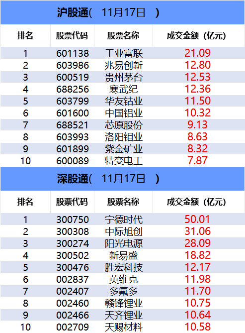 沪深股通今日合计成交2130.01亿,其中工业富联和宁德时代分居沪股通和深股通个股成交额首位。板块主力资金方 面,计算机板块主力资金净流入居首。ETF成交方面,日经225ETF(513880)成交额环比增长338%。期指持仓方 面,IF合约多头加仓数量大于空头。龙虎榜方面,中矿资源遭三家机构卖出3.68亿,同时获一家机构买入1.06亿, 一家量化席位(开源证券西安西大街)买入8110万。永太科技遭三家机构卖出1.42亿。盛新锂能遭两家机构卖出 8016万,同时获一家机构买入3148万,一家实力游资席位(国泰海通证券上海新闸路)买入7975万。雅化集团获四 家机构买入1.86亿,四家机构卖出1.44亿。 一、沪深股通前十大成交 今日沪股通总成交金额为1004.13亿,深股通总成交金额为1125.87亿。 | | | 沖股通( 11月17日 | | | --- | --- | --- | --- | | 排名 | 股票代码 | 股票名称 | 成交金额(亿元) | | 1 | 601138 | 工业富联 | 21.09 | | 2 | 603986 | 兆易创新 | 12.80 | | 3 | 600519 | 贵 ...