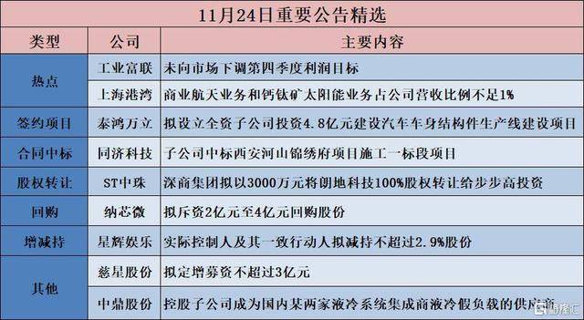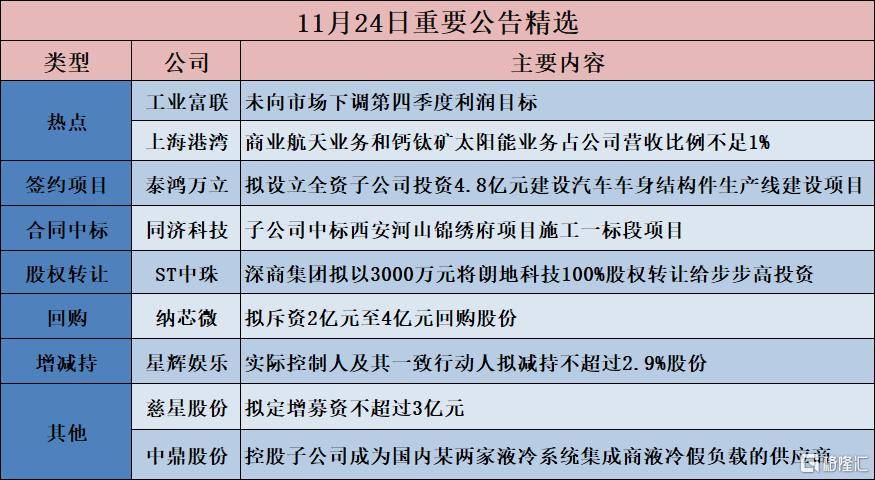 | | | 11月24日重要公告精选 | | --- | --- | --- | | 类型 | 公司 | 主要内容 | | 热点 | 工业富联 | 未向市场下调第四季度利润目标 | | | 上海港湾 | 商业航天业务和钙钛矿太阳能业务占公司营收比例不是1% | | 签约项目 | 奏鸿万立 | 拟设立全资了公司投资4.8亿元建设汽车车身结构件生产线建设项目 | | 合同中标 | 同济科技 | 子公司中标西安河山锦绣府项目施工一标段项目 | | 股权转让 | ST中珠 | 深商集团拟以3000万元将朗地科技100%股权转让给步步高投资 | | 回购 | 纳芯微 | 拟斥资2亿元至4亿元回购股份 | | 增减持 | 是辉娱乐 | 实际控制人及其一致行动人拟减持不超过2.9%股份 | | 其他 | 慈星股份 | 拟定增募资不超过3亿元 | | | 中鼎股份 | 控股子公司成为国内某两家液冷系统集成商液冷假负载的供应商品 | 【热点】 工业富联(601138.SH):未向市场下调第四季度利润目标 上海港湾(605598.SH):商业航天业务和钙钛矿太阳能业务占公司营收比例不足1%,规模较小,且尚未 盈利【项目投资】 东 ...