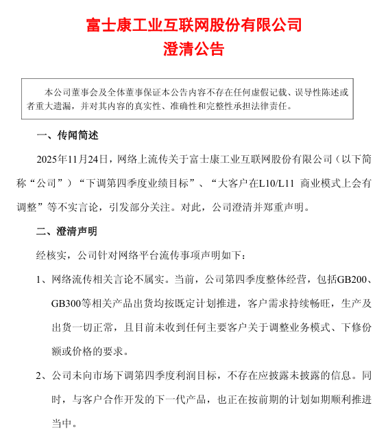 公告补充,公司未向市场下调第四季度利润目标,不存在应披露未披露的信息。同时,与客户合作开发 的下一代产品,也正在按前期的计划如期顺利推进当中。 11月24日,网络上流传关于工业富联(601138.SH)"下调第四季度业绩目标""大客户在L10/L11商业模 式上会有调整"等言论。相关传闻让工业富联盘中一度跌停,截至11月24日收盘,工业富联 (601138.SH)跌7.80%,报55.94元/股。 同日晚上,工业富联(601138.SH)发布公告称,网络流传相关言论不属实。当前,公司第四季度整体 经营,包括GB200、GB300等相关产品出货均按既定计划推进,客户需求持续畅旺,生产及出货一切正 常,且目前未收到任何主要客户关于调整业务模式、下修份额或价格的要求。 ...