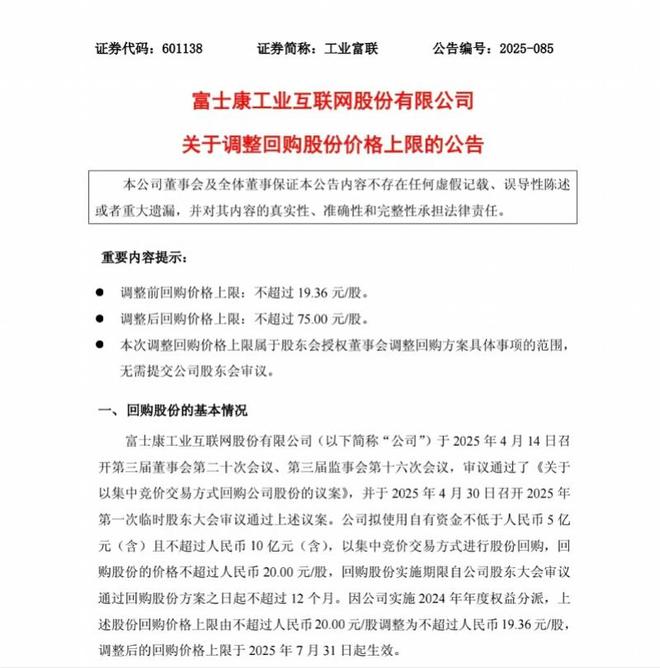 19.36元至75元!万亿巨头工业富联大幅提升回购价上限