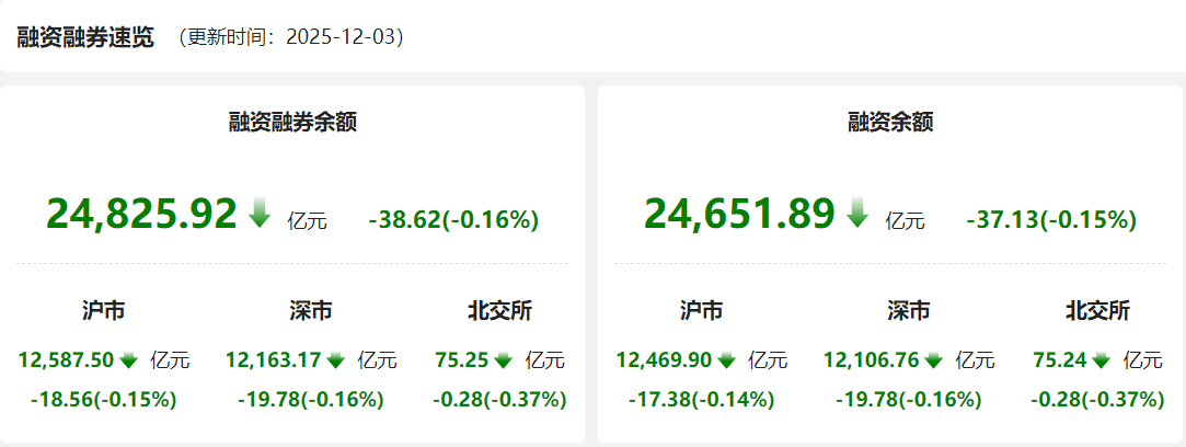 | 融资融券余额 | | | 融资余额 | | | --- | --- | --- | --- | --- | | 24,825.92↓ 亿元 -38.62(-0.16%) | | | 24,651.89 ↓ 亿元 - 37.13(-0.15%) | | | 沪市 | 深市 | 北交所 | 沪市 | 深市 北交所 | | 12,587.50 ♥ 亿元 12,163.17 ♥ 亿元 75.25 ♥ 亿元 | | | | 12,469.90 ♥ 亿元 - 12,106.76 ♥ 亿元 - 75.24 ♥ 亿元 | | -18.56(-0.15%) | -19.78(-0.16%) | -0.28(-0.37%) | -17.38(-0.14%) | -19.78(-0.16%) | 资金流向方面,申万31个一级行业中有10个行业获融资净买入,其中,通信行业获融资净买入额居首,当日净买入9.27亿元;获融资净买入居前的行业还有 有色金属、银行、食品饮料、国防军工、轻工制造等。 个股方面,17股获融资净买入额超1亿元。工业富联获融资净买入额居首,净买入8.17亿元;融资净买入金额居前的还有中国铀业、天孚通信、中兴通讯 ...