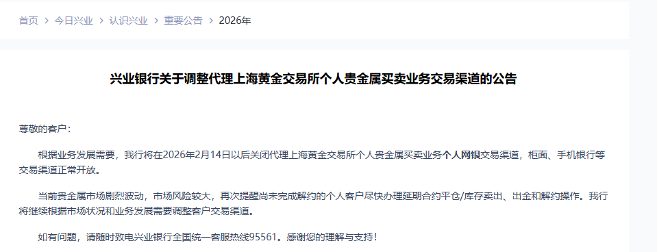 苏商银行特约研究员张思远也分析,从风险特性看,网银渠道具有交易便捷性高、操作自主性强的特 点,易引发高频交易或非理性追涨杀跌行为,尤其在黄金价格短期波动剧烈的情况下,投资者风险敞口 快速扩大。因此,银行正引导交易向更具管控能力的渠道迁移。 #兴业银行将关闭个人黄金网银交易渠道#【银行关闭网银交易渠道 个人贵金属业务将全面收紧?】在 频繁上调黄金积存业务起投门槛之后,近来,又有银行宣布关闭个人贵金属买卖的网银交易渠道。随着 黄金、白银价格宽幅震荡加剧,个人贵金属投资的相关业务风险管控持续升级。 兴业银行日前发布公告称,根据业务发展需要,将在2026年2月14日以后关闭代理上海黄金交易所个人 贵金属买卖业务个人网银交易渠道,柜面、手机银行等交易渠道正常开放。 兴业银行在公告中表示,当前贵金属市场剧烈波动,市场风险较大,再次提醒尚未完成解约的个人客户 尽快办理延期合约平仓/库存卖出、出金和解约操作。该行将继续根据市场状况和业务发展需要调整客 户交易渠道。 在中经传媒智库专家、中国城市发展研究院投资部副主任袁帅看来,银行选择关闭个人贵金属买卖业务 的网银交易渠道,保留柜面和手机银行渠道,本质上是在风险管控和业务优化之 ...