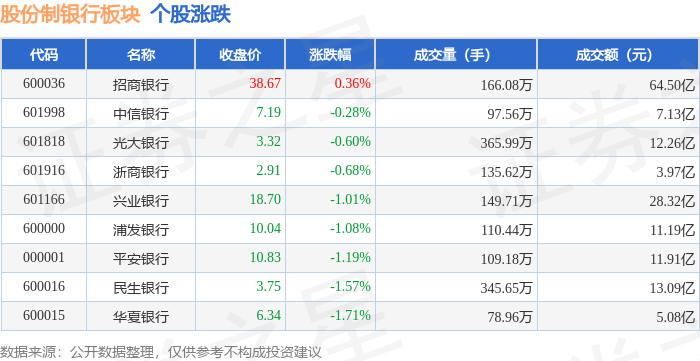 证券之星消息,1月30日股份制银行板块较上一交易日下跌0.53%,华夏银行领跌。当日上证指数报收于4117.95,下跌0.96%。深证成指报收于 14205.89,下跌0.66%。股份制银行板块个股涨跌见下表: | 代码 | 名称 | 收盘价 | 涨跌幅 | 成交量(手) | 成交额(元) | | --- | --- | --- | --- | --- | --- | | 600036 | 招商银行 | 38.67 | 0.36% | 166.08万 | 64.50 Z | | 6616009 | 中信银行 | 7.19 | -0.28% | 97.56万 | 7.13亿 | | 601818 | 光大银行 | 3.32 | -0.60% | 365.99万 | 12.26亿 | | 601916 | 浙商银行 | 2.91 | -0.68% | 135.62万 | 3.97亿 | | 601166 | 兴业银行 | 18.70 | -1.01% | 149.71万 | 28.32 乙 | | 600000 | 浦发银行 | 10.04 | -1.08% | 110.44万 | 11.19亿 | | 0000 ...