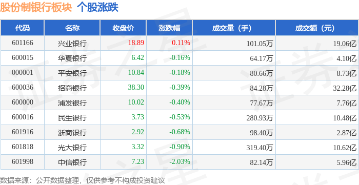 | 代码 | 名称 | 收盘价 | 涨跌幅 | 成交量(手) | 成交额(元) | | --- | --- | --- | --- | --- | --- | | 601166 | 兴业银行 | 18.89 | 0.11% | 101.05万 | 19.06亿 | | 600015 | 华夏银行 | 6.42 | -0.16% | 64.17万 | 4.10亿 | | 000001 | 平安银行 | 10.84 | -0.18% | 80.66万 | 8.73亿 | | 600036 | 招商银行 | 38.30 | -0.39% | 84.28万 | 32.28亿 | | 600000 | 浦发银行 | 10.02 | -0.40% | 77.67万 | 7.76亿 | | 600016 | 民生银行 | 3.73 | -0.53% | 280.93万 | 10.48亿 | | 601916 | 浙商银行 | 2.92 | -0.68% | 98.40万 | 2.87亿 | | 601818 | 光大银行 | 3.32 | -0.90% | 319.40万 | 10.62亿 | | 661698 | 中信银 ...