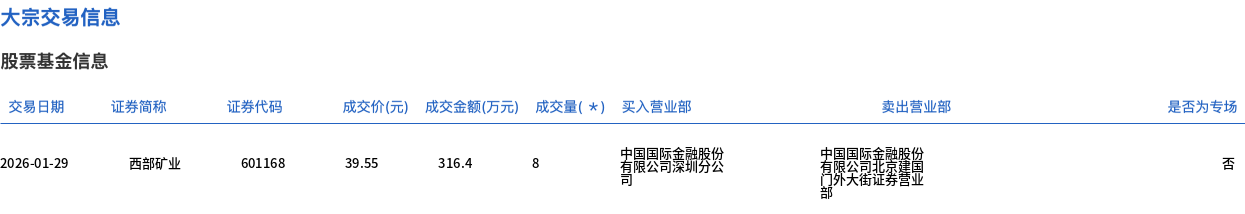 | 交易日期 | 证券简称 | 证券代码 | 成交价(元) 成交金额(万元) 成交量( * ) 买入营业部 | | | 卖出营业部 | | --- | --- | --- | --- | --- | --- | --- | | 2026-01-29 | 西部矿业 | 601168 | 39.55 316.4 | 中国国际金融券公 | 有限公司我是貨貨 | | 1月29日,西部矿业大宗交易成交8万股,成交额316.4万元,占当日总成交额的0.05%,成交价39.55元,较市场收盘价39.55元持平。 ...