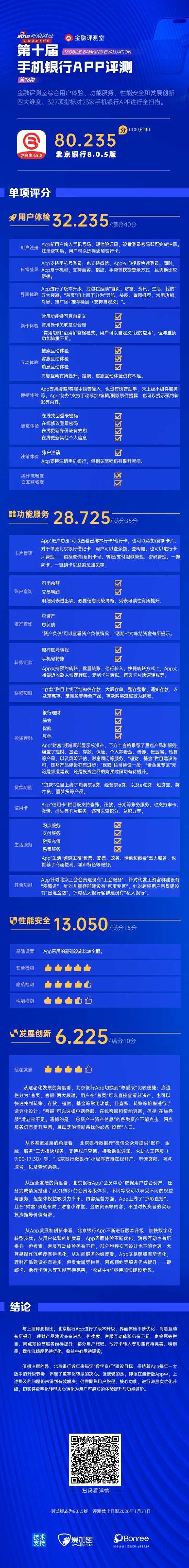 新浪金融评测室综合用户体验、功能服务、性能安全、发展创新4大维度,327项细分指标对北京银行手 机银行App"京彩生活"进行全扫描,最终给予80.235分(总分100)。 与上届评测相比,北京银行App进行了版本升级,界面体验不断优化,消息互动有所提升,理财产品建 设亦有进步,但搜索、客服互动体验仍有不足,贵金属等栏目、网点预约等服务尚待提升,部分用户旅 程、他行卡转入等功能也待完善。特别是,操作流畅度仍待优化,收益中心亟待建设。 值得注意的是,北京银行近年来锚定"数字京行"建设目标,保持着App每年一大版本的升级节奏,体现 了数字化转型的决心。但遗憾的是,即便在最新版App中,上述提及的问题仍未得到有效解决,仍需聚 焦用户旅程、核心功能,进行深层次优化升级,切实将数字化转型决心转化为用户可感知的体验提升与 功能进阶。 评测报告 | | App又传于机与豆求,也又传试后、Apple ID安仪状迷豆求。同时, | | --- | --- | | | 日常登录 App基于机型,支持面容、指纹、手势等快捷登录方式,且切换比较 便捷。 | | | App进行了版本升级,底边栏延续"直页、财富、资讯、生活、我的" | ...