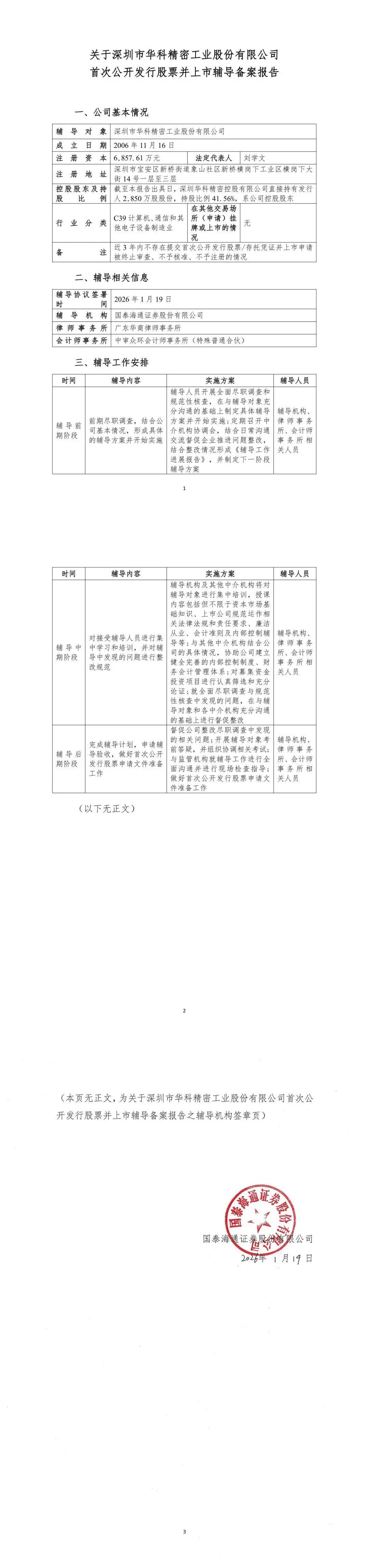 深圳华科精密IPO辅导备案,国泰海通保荐,精密金属行业