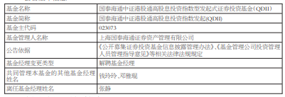 中国经济网北京2月6日讯 今日,国泰海通资管公告,张静离任国泰海通中证港股通高股息投资指 数发起(QDII)、国泰海通中证香港科技指数发起(QDII)。 张静历任英国瑞盟集团、上海敦煌财富管理公司家族办公室负责人,负责客户家族资产海外投资管 理;2016年8月加入上海国泰君安证券资产管理有限公司,历任跨境业务部、国际业务部、全球资本市 场部总经理助理,现任综合策略投资部总经理助理。自2024年10月8日起担任基金经理。 | 基金名称 | 国泰海通中证港股通高股息投资指数型发起式证券投资基金(QDII) | | --- | --- | | 基金简称 | 国泰海通中证灌胶通高股息投资指数发起(QDII) | | 基金主代码 | 023073 | | 基金管理人名称 | 上海国泰海迪正券资产管理有限公司 | | 公告依据 | 《公开募集证券投资基金信息技解管理办法》、《东企管理公司投资管理 人员管理指导意见》等相关法律法规规定 | | 基金经理变更差型 | 解聘基金经理 | | 共同管理本基金的其他基金经理 姓名 | 钱玲玲,邓雅琨 | | 离任基金经理姓名 | 张静 | | 基金名称 | 国泰海通中证香港科技指数 ...