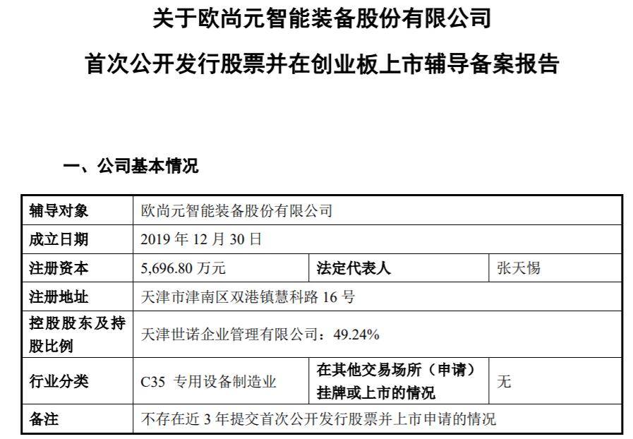 | 辅导对象 | 欧尚元智能装备股份有限公司 | | | --- | --- | --- | | 成立日期 | 2019年12月30日 | | | 注册资本 | 5,696.80 万元 法定代表人 | 张天惕 | | 注册地址 | 天津市津南区双港镇慧科路 16号 | | | 控股股东及持 股比例 | 天津世诺企业管理有限公司:49.24% | | | 行业分类 | 在其他交易场所(申请) C35 专用设备制造业 挂牌或上市的情况 | 无 | | 各注 | 不存在近3年提交首次公开发行股票并上市申请的情况 | | 瑞财经 王敏 10月23日,欧尚元智能装备股份有限公司(以下简称"欧尚元")在天津证监局启动IPO辅导备案,拟创业板上市,辅导机构为国泰海通。 欧尚元成立于2019年12月,注册资本5696.8万元,法定代表人为张天惕。公司控股股东为天津世诺企业管理有限公司,持股49.24%。 据天眼查,张天惕通过天津世诺企业管理有限公司、天津诚兆和企业管理合伙企业(有限合伙)、天津诚助企业管理服务合伙企业(有限合伙)合计控股 59.58%。 目前,张天惕担任公司董事长、执行公司事务的董事、经理。 相关公司:国泰, ...