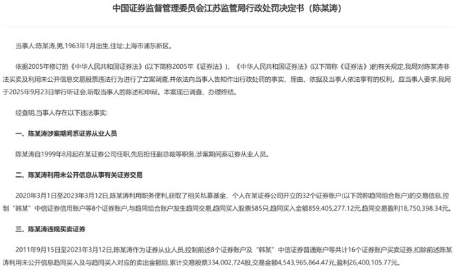 21世纪经济报道记者 孙永乐 又一张亿元级罚单! 近日,江苏证监局披露一笔天价罚单,因利用未公开信息从事有关证券交易、违规买卖证券,曾担任某 证券公司副总裁的陈某涛,被江苏证监局"没一罚二"合计罚没1.35亿元,并被采取8年及5年两项证券市 场禁入措施。 值得一提的是,在听证过程中,当事人提出申辩意见,称自身"曾为金融行业作出贡献",请求将罚款倍 数调减至一倍,但这一诉求未获证监局采纳。 21世纪经济报道记者查询资料发现,某头部券商一位原副总裁的出生时间、任职时间等信息,与本案当 事人完全吻合。经向知情人士求证,确认本案受罚的券商高管,为时任国泰君安证券副总裁陈煜涛。 罚单显示,陈某涛出生于1963年1月,自1999年8月起在某证券公司任职,先后担任副总裁等职务,涉案 期间系证券从业人员。巧合的是,时任国泰君安证券副总裁的陈煜涛,其出生日期、任职时间与上述人 员完全吻合。 21世纪经济报道记者向知情人士求证后确认,二者为同一人。过往履历显示,陈煜涛是国泰君安的资深 元老,曾任国泰君安证券副总裁、首席信息官,国泰君安期货党委书记、董事长,并担任上海市期货同 业公会会长。 他于1993年7月起历任国泰证券研究部职 ...