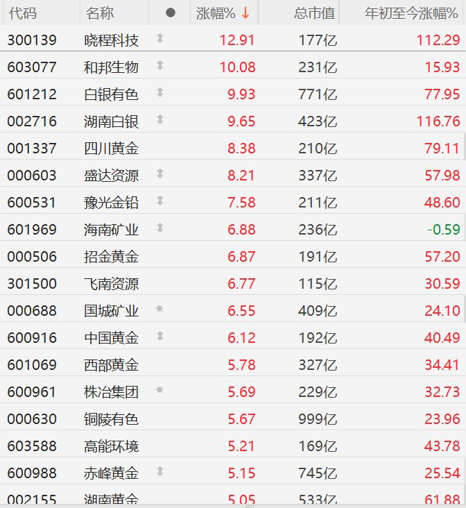 | 代码 | 名称 | | 涨幅% ↓ | 总市值 | 年初至今涨幅% | | --- | --- | --- | --- | --- | --- | | 300139 | 晓程科技 | 1 | 12.91 | 177亿 | 112.29 | | 603077 | 和邦生物 | 1 | 10.08 | 231亿 | 15.93 | | 601212 | 日银有色 | 1 | 9.93 | 771亿 | 77.95 | | 002716 | 湖南白银 | 1 | 9.65 | 423亿 | 116.76 | | 001337 | 四川黄金 | | 8.38 | 210亿 | 79.11 | | 000603 | 盛达资源 | 1 | 8.21 | 337亿 | 57.98 | | 600531 | 豫光金铅 | 1 | 7.58 | 211亿 | 48.60 | | 601969 | 母国外业 | 1 | 6.88 | 236亿 | -0.59 | | 000506 | 招我黄金 | | 6.87 | 191亿 | 57.20 | | 301500 | 飞南资源 | | 6.77 | 115亿 | 30.59 ...