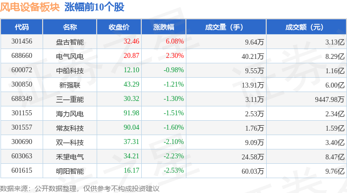 证券之星消息,10月16日风电设备板块较上一交易日下跌2.64%,吉鑫科技领跌。当日上证指数报收于 3916.23,上涨0.1%。深证成指报收于13086.41,下跌0.25%。风电设备板块个股涨跌见下表: | 代码 | 名称 | 收盘价 | 涨跌幅 | 成交量(手) | 成交额(元) | | | --- | --- | --- | --- | --- | --- | --- | | 301456 | 盘古智能 | 32.46 | 6.08% | 9.64万 | | 3.13亿 | | 688660 | 电气风电 | 20.87 | 2.30% | 40.21万 | | 8.29亿 | | 600072 | 中船科技 | 12.10 | -0.98% | 9.55万 | | 1.16亿 | | 300850 | 新强联 | 43.29 | -1.21% | 13.91万 | | 6.00亿 | | 688349 | 三一重能 | 30.32 | -1.30% | 3.11万 | | 9447.98万 | | 301155 | 海力风电 | 91.98 | -1.51% | 2.53万 | | 2.34亿 | ...