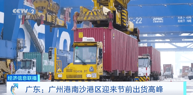 (央视财经《经济信息联播》)随着春节临近,各地企业集中安排节前出货,位于广东的广州港南沙港 区迎来了出货高峰期,广州港各部门联合调度,确保高效作业。 编辑:令文芳 广州港南沙港区一二期码头总经理 范健文:根据各码头作业情况,动态调整资源分配,保障物流高峰 货物的正常流转。此外,南沙港区在节前完成闸口系统互联互通,并依托精细化管理机制,优先保障临 近船期货物的及时进港与高效出运。 转载请注明央视财经 数据显示,2月以来,广州港南沙港区日均完成外贸集装箱吞吐量约4万标准箱,日均处理外贸集装箱班 轮约18艘次,进闸车辆约16000车次。 为有效应对节前高峰,广州港通过对多条集装箱支线协同调度,并提前预判内陆企业出口运力需求,开 展联合调度,目前,广州港南沙港区已形成"水路+铁路+公路"多式联运网络,为腹地制造业提供物流 支线服务,确保企业节前发货"不断档"。 ...