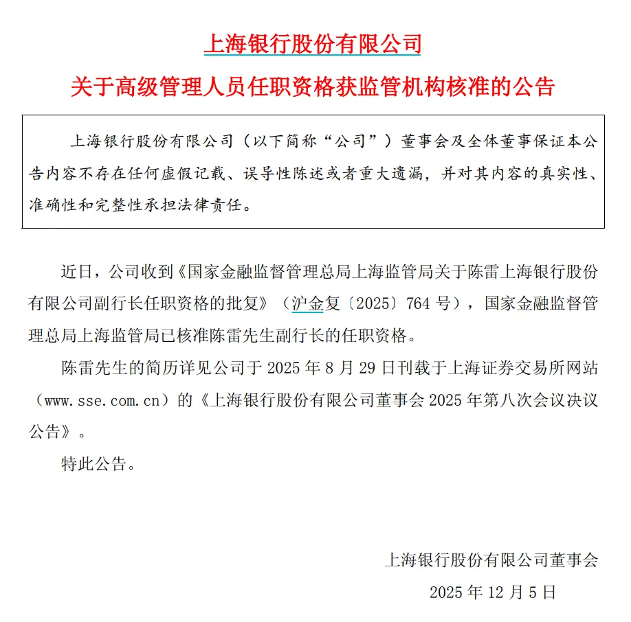 12月4日,上海银行(601229)发布公告称,近日该行收到《国家金融监督管理总局上海监管局关于陈雷上海银行股份有限公司副 行长任职资格的批复》(沪金复〔2025〕764 号),国家金融监督管理总局上海监管局已核准陈雷副行长的任职资格。 (上海银行) ...
