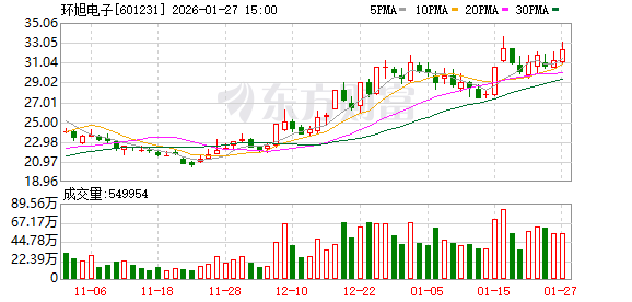 截至2026年1月30日收盘,环旭电子(601231)报收于33.88元,较上周的30.58元上涨10.79%。本周, 环旭电子1月29日盘中最高价报33.88元,股价触及近一年最高点。1月26日盘中最低价报30.5元。本周共 计1次涨停收盘,无跌停收盘情况。环旭电子当前最新总市值809.43亿元,在消费电子板块市值排名 8/90,在两市A股市值排名240/5184。 本周关注点 公司公告汇总 关于实施"环旭转债"赎回暨摘牌的第四次提示性公告 环旭电子发布"环旭转债"赎回暨摘牌的最后一次提示性公告。赎回登记日为2026年1月28日,赎回价格 为101.6323元/张,赎回款发放日为2026年1月29日。最后交易日为2026年1月23日,自1月26日起停止交 易。最后转股日为2026年1月28日。因公司股价连续30个交易日中有20个交易日不低于转股价格的 130%,已触发有条件赎回条款。公司决定行使提前赎回权,赎回完成后"环旭转债"将于1月29日起在上 交所摘牌。持有人如未及时转股,可能面临较大投资损失。 关于"环旭转债"赎回结果暨股份变动的公告 环旭电子发布"环旭转债"赎回结果暨股份变动的公告。本次赎回数量为 ...