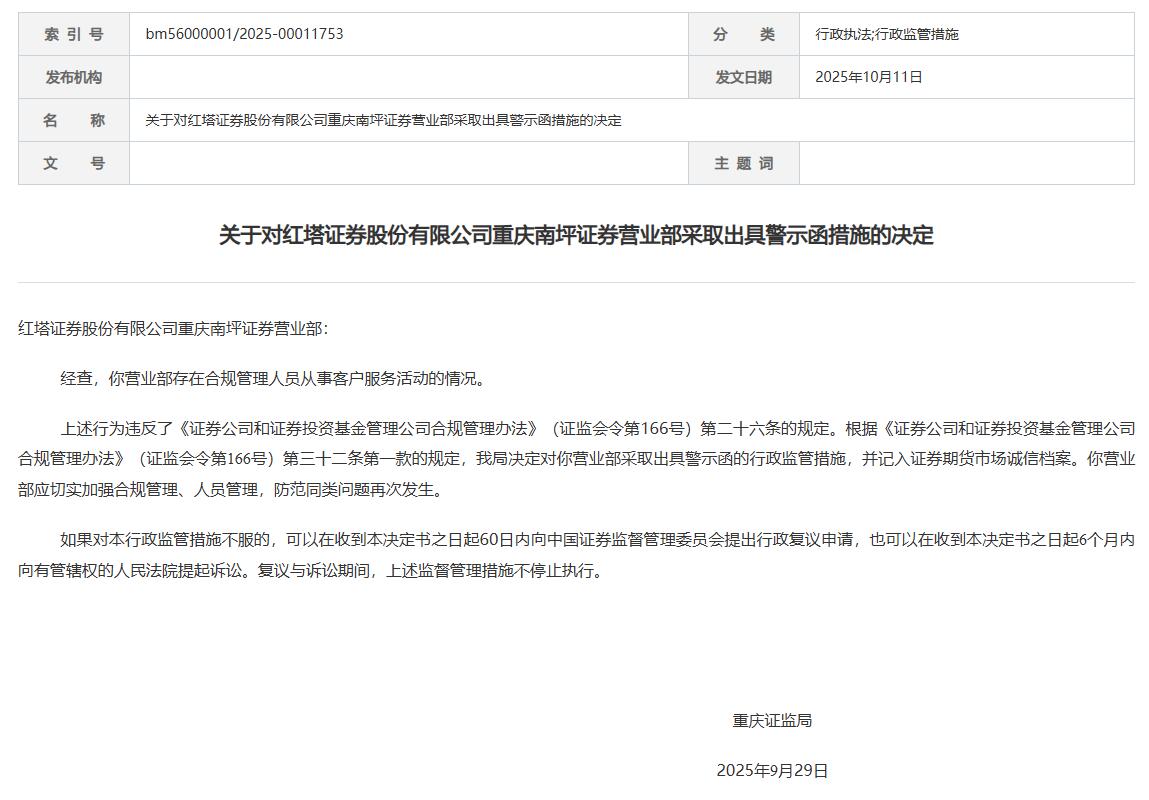 | 索 引 号 | bm56000001/2025-00011753 | સે | 米 | 行政执法;行政监管措施 | | --- | --- | --- | --- | --- | | 发布机构 | | 发文日期 | | 2025年10月11日 | | 称 名 | 关于对红塔证券股份有限公司重庆南坪证券营业部采取出具警示函措施的决定 | | | | | 文 름 | | 主题词 | | | 北京商报讯(记者 郝彦)10月11日,重庆证监局发布公告表示,红塔证券(601236)重庆南坪证券营业部存在合规管理人员从事客户服务活动的情况。 上述行为违反规定,重庆证监局决定对该营业部采取出具警示函的行政监管措施,并记入证券期货市场诚信档案。 ...