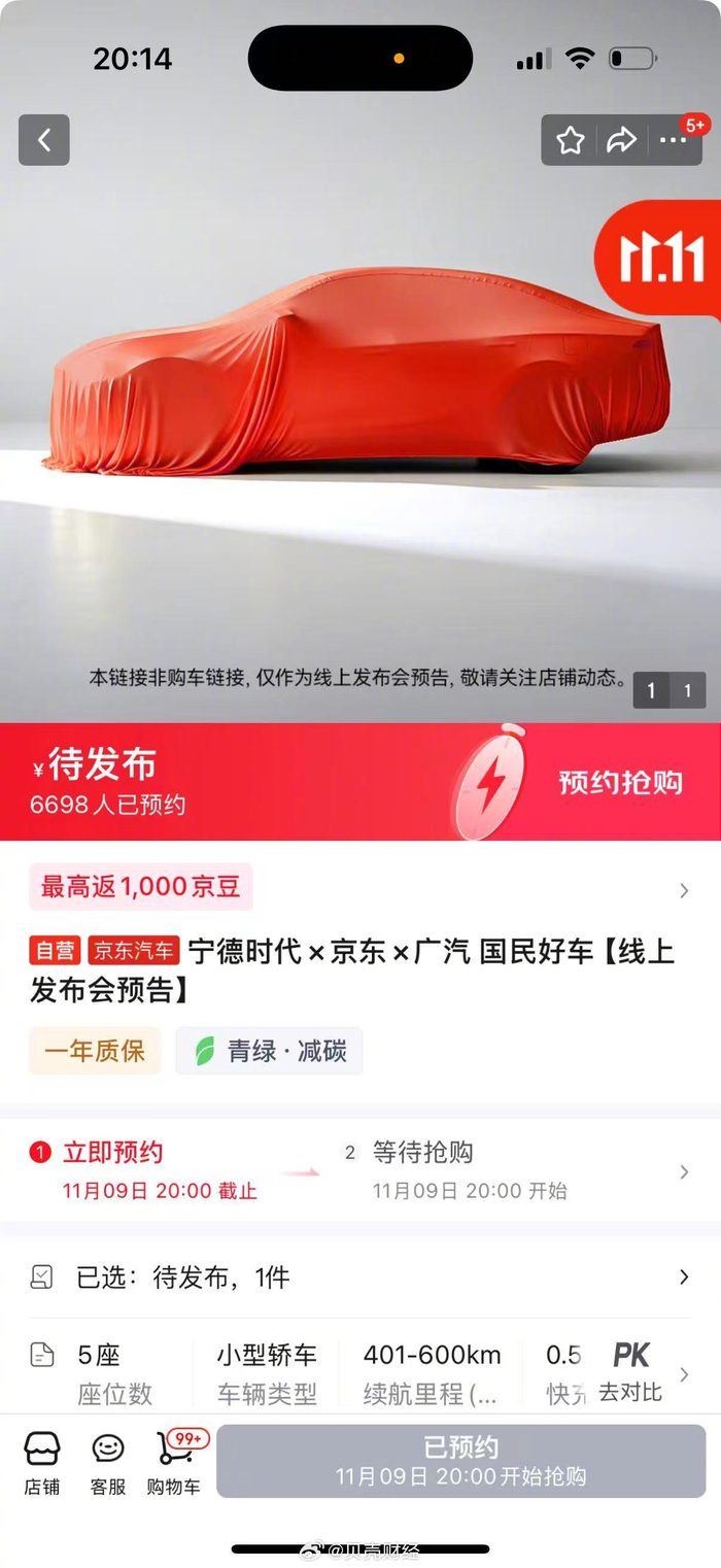 【京东首次披露造车数据,将采用车电分离购车模式】 #京东首次披露造车细节##京东推车电分离购车 模式# 新京报贝壳财经讯(记者程子姣)10月20日,京东汽车此前宣布将联合宁德时代和广汽集团共同推出一 款"国民好车"的相关车辆细节曝光。 京东相关车辆预约页面显示,该车在车身结构方面,其采用高强度笼式车身设计,高强度钢占比超 70%,正面立体防护框架使车身抗冲击性提升18%;侧面配备一体式热成型双门环,采用特斯拉 Cybertruck同款侧面防护技术,搭配新国标机械式半隐藏安全门把手。在性能层面,车辆整备质量超同 级车型300kg,轮距超同级(同级别车辆)水平45mm、胎宽超同级水平10mm;麋鹿测试成绩超 75km/h。 新京报贝壳财经记者了解到,该车还将采用"车电分离"的购车模式,电池可充可换,换电时间将低至99 秒。 车型示意图仅供参考 最高返1,000京豆 > 自营 京东汽车 宁德时代 × 京东 × 广汽 国民好车【线上 发布会预告】 一年质保 / 青绿 · 咸碳 0 立即预约 2 等待抢购 > 11月09日 20:00 开始 11月09日 20:00 截止 呂 已选:待发布,1件 > e 小型轿车 0. ...