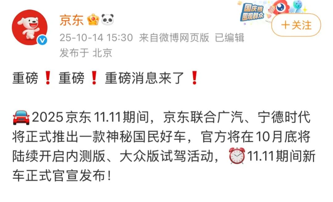 京东有大消息! 10月14日,京东微博宣布,联合广汽、宁德时代将推出一款汽车,官方将在10月底陆续开启内测版、大众版试驾活动,11月9日新车正式官宣发布。 随后,今年新成立的汽车央企长安集团发文:长安万里,京彩纷呈!期待与未来出行新伙伴@京东的惊喜合作! 今日京东"双11"开放日上,《每日经济新闻》记者现场注意到,京东汽车宣布联合宁德时代旗下时代电服和广汽集团共同推出一款"国民好车"。 该车将在安全性、电池与补能、用车配套服务、价格等方面实现突破。 该车将于京东"双11"期间正式发布,并在京东进行独家销售。即日起,用户可在京东App搜索"国民好车"提前预约试驾。 据了解,时代电服作为宁德时代的全资子公司,主攻换电业务,此前已推出了巧克力换电整体解决方案。其官方公众号今年4月曾发文披露了与广汽的合 作,该文彼时称"广汽集团旗下埃安UT、埃安RT、埃安V霸王龙与一款即将上市的A级SUV,将全面推出巧克力换电车型",并透露广汽集团作为首家与巧 克力换电全生态合作的车企,将在更多旗下车型引入巧克力标准等。 值得注意的是,京东在汽车行业的布局已延续多年。 早在2015年,刘强东就通过个人身份投资了蔚来汽车。当时,章泽天 ...