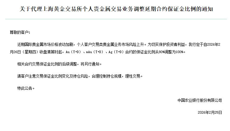 北京商报讯(记者 孟凡霞 周义力)2月25日,农业银行发布公告称,近期国际贵金属市场价格波动加 剧,个人客户交易类贵金属业务市场风险上升。为切实保护投资者利益,该行定于自2026年2月26日 (星期四)收盘清算时起,Au(T+D)、mAu(T+D)、Ag(T+D)合约的保证金比例从80%调整为 100%。相关合约交易保证金比例的后续调整,将另行通知。农业银行提醒,请客户注意交易保证金比 例变化及持仓风险,合理控制持仓规模,理性交易。 ...