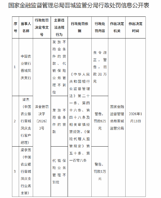 责任编辑:王馨茹 1月16日金融一线消息,据国家金融监督管理总局晋城监管分局行政处罚信息公开表显示,中国农业银 行晋城凤庆支行因发放不符合条件的贷款、代销保险业务管理不到位,被责令改正,警告,罚款31万 元。 同时,梁杰(中国农业银行晋城凤庆支行客户经理)因发放不符合条件的贷款被警告并罚款6万元;梁 李芳(中国农业银行晋城凤庆支行业务主管)因代销保险业务管理不到位被警告并罚款1万元。 1月16日金融一线消息,据国家金融监督管理总局晋城监管分局行政处罚信息公开表显示,中国农业银 行晋城凤庆支行因发放不符合条件的贷款、代销保险业务管理不到位,被责令改正,警告,罚款31万 元。 同时,梁杰(中国农业银行晋城凤庆支行客户经理)因发放不符合条件的贷款被警告并罚款6万元;梁 李芳(中国农业银行晋城凤庆支行业务主管)因代销保险业务管理不到位被警告并罚款1万元。 | 序 | 当事人 | 行政处罚 | 主要谱 | 行政处罚依 | 行政处 | 作出决定 | 作出决定 | | --- | --- | --- | --- | --- | --- | --- | --- | | | | 决定书文 | 法违规 | | | | | | 릉 ...