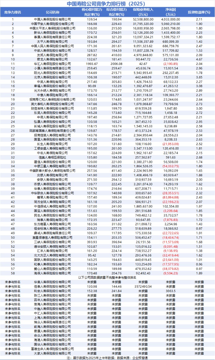 近日,21世纪经济报道保险课题组在由南方财经全媒体集团指导、21世纪经济报道主办的"第二十届21 世纪金融年会"上发布《中国保险业竞争力研究报告(2025)》(以下简称"《报告》")。 《报告》以各公司主要经营保险业务分类,分为寿险公司、财险公司、养老险公司、健康险公司四类公 司,并在不同组别以相同的大类维度和不同业务独有的小类维度进行分组别研究分析。 《报告》显示,2025年上半年,中国寿险业在"报行合一"深化、预定利率动态调整等政策推动下,呈现 出显著的"强者恒强"格局。参与竞争力排名的58家寿险公司在2025年上半年合计盈利1763.08亿元,其 中前十名寿险公司净利润占比高达94.6%,行业资源加速向头部集中。 新华保险、泰康人寿紧随前三 2025年上半年,中国寿险市场头部效应持续强化,五家头部寿险公司以卓越的业绩表现领跑行业。 根据《报告》,寿险行业前五名——中国人寿、平安人寿、太保寿险、新华保险与泰康人寿,2025年上 半年净利润均突破百亿元,展现出强大的盈利能力和市场竞争力。 | | | 核心偿付能力 | 中国寿险公司竞争力排行榜 (2025) 综合偿付能力 | 估龄的人 | 净利润 | | | ...