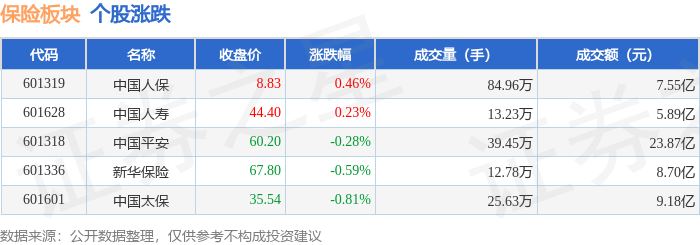 从资金流向上来看,当日保险板块主力资金净流入1.54亿元,游资资金净流出1.22亿元,散户资金净流出 3198.02万元。保险板块个股资金流向见下表: | 代码 | 名称 | 主力净流入(元) | 主力净占比 游资净流入 (元) | | 游资净占比 散户净流入 (元) | | 散户净占比 | | --- | --- | --- | --- | --- | --- | --- | --- | | 601319 中国人保 | | 8308.06万 | 11.01% | -3085.62万 | -4.09% | -5222.44万 | -6.92% | | 601628 中国人寿 | | 5850.44万 | 9.94% | -2822.40万 | -4.79% | -3028.04万 | -5.14% | | 601318 中国平安 | | 4658.54万 | 1.95% | 402.31万 | 0.17% | -5060.85万 | -2.12% | | 601336 新华保险 | | -151.00万 | -0.17% | -2901.16万 | -3.33% | 3052.17万 | 3.51% | | ...