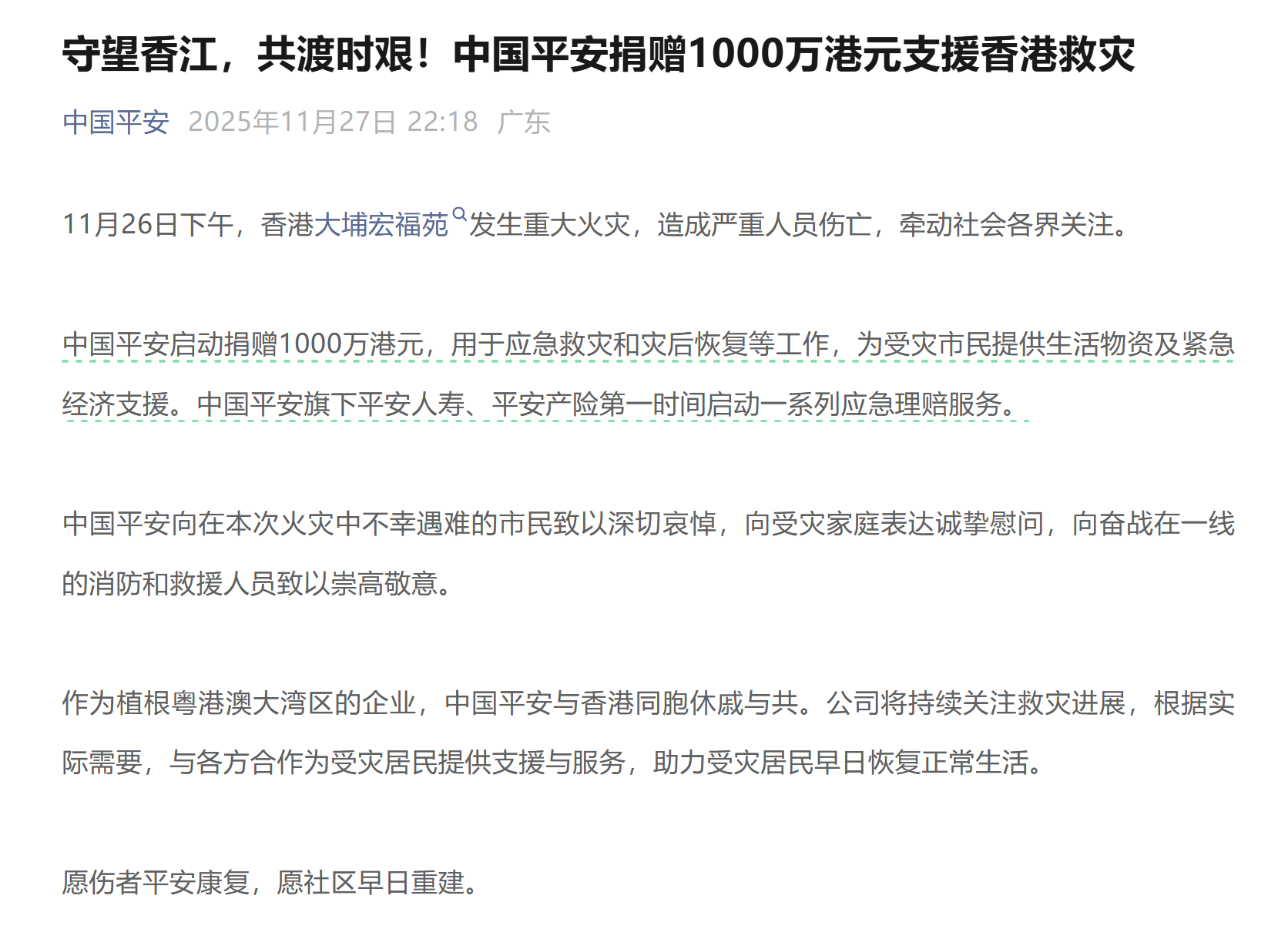 作为植根粤港澳大湾区的企业,中国平安与香港同胞休戚与共。公司将持续关注救灾进展, 根据实际需要,与各方合作为受灾居民提供支援与服务,助力受灾居民早日恢复正常生活。 11月26日下午,香港大埔宏福苑发生重大火灾,造成严重人员伤亡,牵动社会各界关注。 愿伤者平安康复,愿社区早日重建。 中国平安向在本次火灾中不幸遇难的市民致以深切哀悼,向受灾家庭表达诚挚慰问,向奋战 在一线的消防和救援人员致以崇高敬意。 中国平安启动捐赠 1000万港元,用于应急救灾和灾后恢复等工作,为受灾市民提供生活物资 及紧急经济支援。中国平安旗下平安人寿、平安产险第一时间启动一系列应急理赔服务。 ...