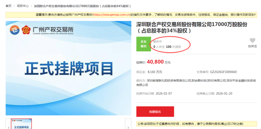 上证报记者在查阅广州产权交易所挂牌项目时了解到,"深圳联合产权交易所股份有限公司17000万股股份(占总股本的34%股权)"于2026年1月7日挂 牌,挂牌价为4.08亿元,保证金为8160万元,挂牌时间为10个工作日。 截至目前,该挂牌信息显示"0人关注,100次浏览"。 深圳联交所的股权结构显示,截至目前,深圳交易集团有限公司持股45%,为第一大股东。深圳市创新投资集团有限公司、财纳易科技(深圳)有限公 司、深圳前海联礼阳投资有限责任公司、深圳平安金融科技咨询有限公司、深圳市高新投集团有限公司分别持股16%、15%、10%、9%、5%。 近日,深圳联合产权交易所股份有限公司(以下简称"深圳联交所")被摆上"货架",中国平安方面在持股8年后拟清空其所持股份。 其中,深圳交易集团有限公司、深圳市创新投资集团有限公司、深圳市高新投集团有限公司均为深圳国资企业。 | 标的企业股权结构 | 序号 | 股东各称 | 持股比例(%) | 股东数量(股) | | --- | --- | --- | --- | --- | | | 1 | 深圳交易集团有限公司 | ਕੇਟ | 225000000 | | | 2 | 深圳市 ...