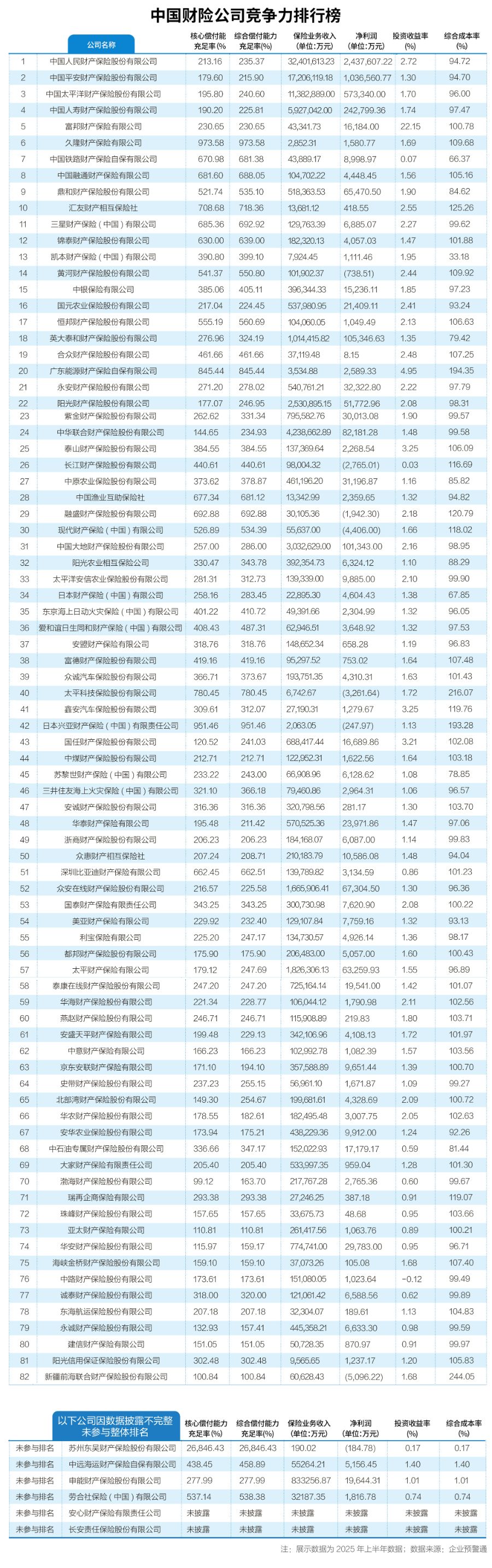 南方财经全媒体记者 林汉垚 | 53 | 077866124888475477 | 101.51 | 516.10 | 109,009.001 | 9,000.00 | L. IU | ne'se | | --- | --- | --- | --- | --- | --- | --- | --- | | 34 | 日本财产保险(中国)有限公司 | 258.16 | 283.45 | 22,895.30 | 4,604.43 | 1.38 | 67.85 | | 35 | 东京海上日动火灾保险(中国)有限公司 | 401.22 | 410.72 | 49,391.66 | 2,304.99 | 1.32 | 96.05 | | 36 | 爱和谊日生同和财产保险(中国)有限公司 | 408.43 | 487.31 | 62,946.51 | 3,648.92 | 1.32 | 97.53 | | 37 | 安盟财产保险有限公司 | 318.76 | 318.76 | 148.652.34 | 658.28 | 1.19 | 96.83 | | 38 | 富德财产保险股份有限公司 | 419.16 | 419.16 ...
