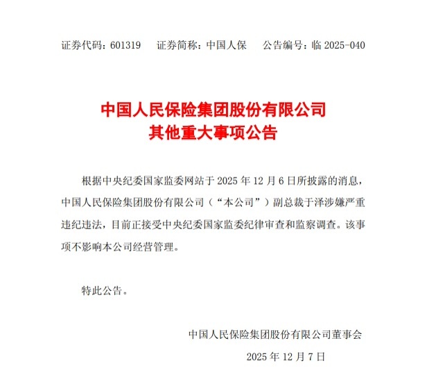 北京商报讯(记者胡永新)12月7日,中国人民保险集团股份有限公司发布公告称,根据中央纪委国家监委网站于2025年12月6日所披露的消息,公司副总裁于 泽涉嫌严重违纪违法,目前正接受中央纪委国家监委纪律审查和监察调查。该事项不影响本公司经营管理。 ...