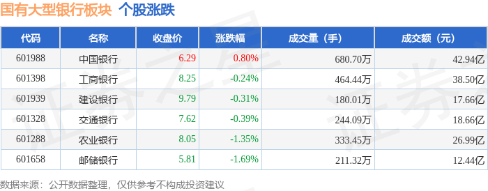 | | | 名称 | 现价 5 元 元 | 涨跌幅 | | --- | --- | --- | --- | --- | | | 601988 0 | 中国银行 | 6.24 c 0.24 | 4.00% | | 2 | 601939 | 建设银行 | 9.82 c 0.30 | 3.15% | | 3 | 601658 | 邮储银行 | 5.91 c 0.18 | 3.14% | | 4 | 600016 | 民生银行 | 4.20 c 0.11 | 2.69% | | 5 | 601818 | 光大银行 | 3.67 c 0.07 | 1.94% | | 6 | 002958 | 青农商行 | 3.25 c 0.06 | 1.88% | | | 600015 | 华夏银行 | 7.11 c 0.13 | 1.86% | | 8 | 601916 | 浙商银行 | 3.16 c 0.05 | 1.61% | | G | 601328 | 交通银行 | 7.65 c 0.12 | 1.59% | | 10 | 601009 | XD南京银 | 11.37c 0.17 | 1.52% | 全市场规模最大的银行ET ...