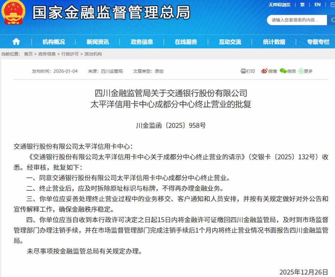 日前,国家金融监管总局网站发布的行政许可文件显示,四川金融监管局同意交通银行太平洋信用卡中心成都分中心终止营业。 批复要求该机构,终止营业后,应及时拆除原址标识与标牌,不得再办理金融业务,妥善处理终止营业过程中的业务移交、客户通知和人员安排,并按有 关规定做好对外公告和宣传解释工作,确保金融秩序稳定。自收到本行政许可决定之日起15日内将金融许可证缴回四川金融监管局,及时到市场监督管理 部门办理注销手续,并在市场监督管理部门完成注销手续后1个月内将终止营业情况书面报告四川金融监管局。批复日期为2025年12月26日。 不久前(2025年12月24日),交行太平洋信用卡中心西安分中心刚刚获批停业,陕西金融监管局同意交通银行太平洋信用卡中心西安分中心终止营业,要 求"该机构立即停止一切经营活动,15个工作日内缴回许可证"。 据不完全统计,2024年下半年以来,交通银行太平洋信用卡中心陆续裁撤59家地方分中心,行政区域涉及北京、上海、江苏、广东、湖南、福建、山东、 河北、陕西、辽宁、吉林、湖北、河南、山西、广西、等31个省级行政区及计划单列市。详细情况如下: | 序号 | 监管局 | 同意终止营业日期 | 终止营业分 ...