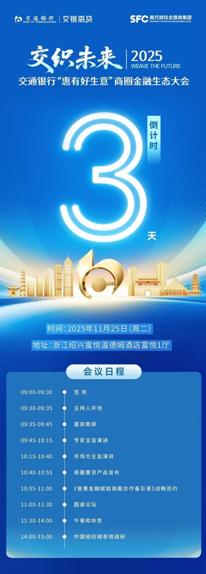 Group 1 - The event titled "惠有好生意"商圈金融生态大会 organized by the Bank of Communications is scheduled for November 25, 2025 [2][3] - The conference will take place at the Wyndham Hotel in Shaoxing, Zhejiang [4] - The agenda includes guest speeches, expert presentations, product launches, and a roundtable forum, followed by a visit to the China Light Textile City [5]