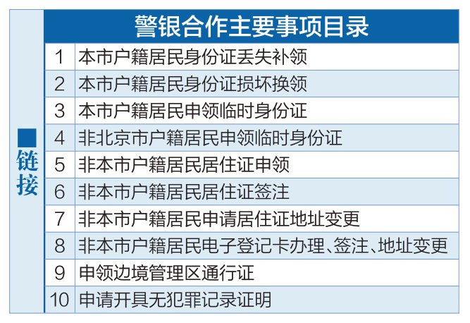 居民在银行办理业务时,如涉及居民身份证、电子居住证(卡)、开具无犯罪记录证明等事项,可以在 服务区由工作人员引导进行网上申请。对于不能全程网办的户政业务,也可以及时获得解答和指引。 目前,作为首家试运营网点,交通银行西单支行营业厅设置搭建的"警银e联服务区"已正式运营。 本报讯(记者孙莹)在银行也能办理身份证换领等政务事项了。昨天,西城公安分局与交通银行北京市 分行在交行西单支行营业厅设立了全市首家"警银e联服务区"。市民在银行办业务时,就能现场申请居 民身份证换领、电子居住证(卡)申领、开具无犯罪记录证明等10项全程网办的公安政务事项。 据了解,"警银e联服务区"集成两大核心功能。一是延伸便民服务。西城公安分局安排专人在银行营业 时间驻守,为居民提供涉及居民身份证、边境管理区通行证、电子居住证(卡)和无犯罪记录证明4大 类共10项全程网办业务的现场申请引导服务,以及其他15项在派出所窗口及自助机办理的户政业务的宣 传指引。二是开展反诈协同宣传,依托银行网点与公安新媒体矩阵,以线上讲座、社区宣讲等形式普及 金融安全知识。 西城公安分局人口管理和基层工作大队相关负责人介绍,近年来,警方大力推动户政服务事项"无接 ...