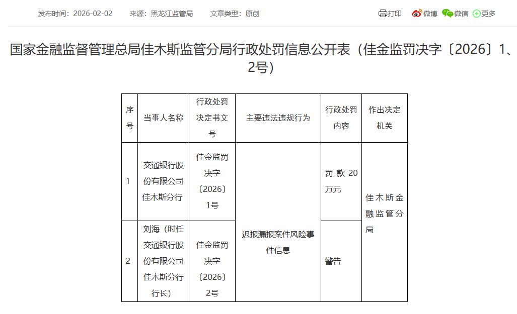 中国经济网北京2月3日讯 国家金融监督管理总局网站昨日公布的佳木斯监管分局行政处罚信息公开表(佳金监罚决字〔2026〕1、2号)显示,交 通银行(601328)股份有限公司佳木斯分行迟报漏报案件风险事件信息被罚款20万元,刘海(时任交通银行股份有限公司佳木斯分行行长)被警 告。 | 序 | 当事人名称 | 行政处罚 决定书文 | 主要违法违规行为 | 行政处罚 | 作出决定 | | --- | --- | --- | --- | --- | --- | | 름 | | | | 内容 | 机关 | | | | 름 | | | | | 1 | 交通银行股 份有限公司 佳木斯分行 | 佳金监罚 决字 | | 罚款20 | | | | | [2026] | | 万元 | 佳木斯金 | | | | 1号 | | | 融监管分 | | | 刘海(时任 | | 识报漏报案件风险事 | | 局 | | | 交通银行股 | 佳金监罚 | 件信息 | | | | 2 | 份有限公司 | 洪字 | | 营告 | | | | 佳木斯分行 | [2026] | | | | | | 行长) | 2号 | | | | 国家金融监督管理总局 ...