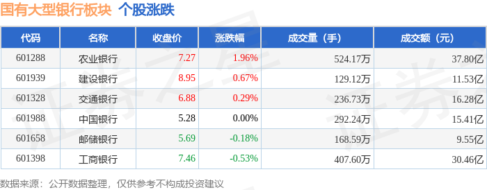 从资金流向上来看,当日国有大型银行板块主力资金净流入3.35亿元,游资资金净流出2208.99万元,散 户资金净流出3.13亿元。国有大型银行板块个股资金流向见下表: | 代码 | 名称 | 主力净流入 (元) | 主力净占比 游资净流入 (元) | | 游资净占比 散户净流入 (元) | | 散户净占比 | | --- | --- | --- | --- | --- | --- | --- | --- | | 601288 农业银行 | | 3.71亿 | 9.81% | -1.20亿 | -3.16% | -2.51亿 | -6.64% | | 601398 工商银行 | | 8745.18万 | 2.87% | -3721.16万 | -1.22% | -5024.03万 | -1.65% | | 601658 邮储银行 | | 3933.44万 | 4.12% | 1598.31万 | 1.67% | -5531.75万 | -5.79% | | 601939 建设银行 | | -1219.31万 | -1.06% | 351.05万 | 0.30% | 868.26万 | 0.75% | | 601 ...