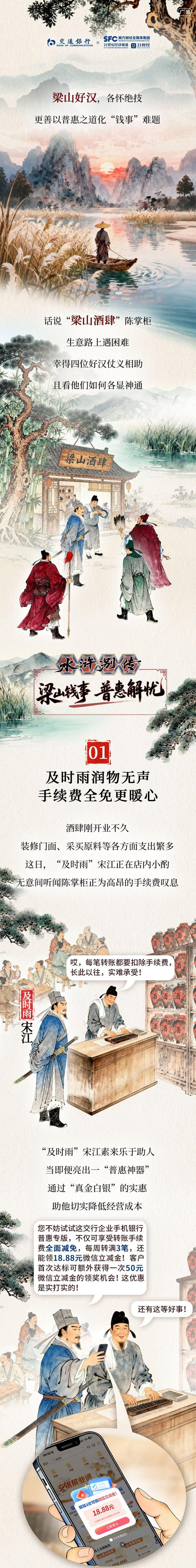 南方财经全媒体集团 交通银行 × #记经济报道 20 21财经 及时雨润物无声 手续费全免更暖心 酒肆刚开业不久 装修门面、采买原料等各方面支出繁多 这日,"及时雨"宋江正在店内小酌 无意间听闻陈掌柜正为高昂的手续费叹息 萬象解 型战线 哎,每笔转账都要扣除手续费。 长此以往,实难承受! "及时雨"宋江素来乐于助人 当即便亮出一"普惠神器" 通过"真金白银"的实惠 助他切实降低经营成本 梁山好汉,各怀绝技 更善以普惠之道化"钱事"难题 话说"梁山酒肆"陈掌柜 生意路上遇困难 幸得四位好汉仗义相助 且看他们如何各显神通 不久后,酒肆经营渐渐步入正轨 陈掌柜欲扩大经营 却为资金犯了难 "智多星"吴用恰巧路过此地 三言两语竟点出陈掌柜心中所想 实在是不好意思,咱们现在 满座了,要不您等会再来? 是时候考虑扩大经营 规模了,不过 ... ... 掌柜的可是在担心资金 问题?吴某愿献一策。 只见他羽扇轻摇 您不妨试试这交行企业手机银行 普惠专版,不仅可享受转账手续 费全面减免,每周转满3笔,还 能领18.88元微信立减金! 客户 首次达标可额外获得一次50元 微信立减金的领奖机会!这优惠 是实打实的! 还有这等好事! ...