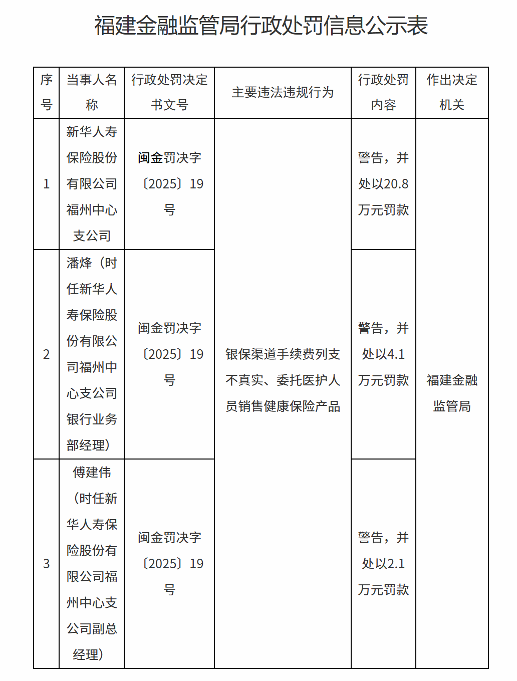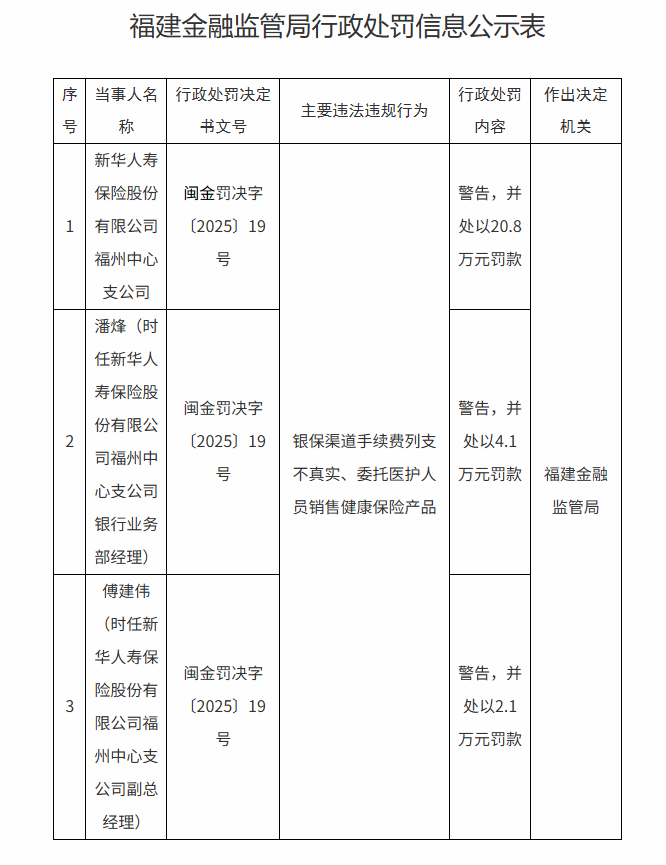| 序 | 当事人名 | 行政处罚决定 | 主要违法违规行为 | 行政处罚 | 作出决定 | | --- | --- | --- | --- | --- | --- | | 를 | 称 新华人寿 | 书文号 | | 内容 | 机关 | | | 保险股份 | 闽金罚决字 | | 警告,并 | | | 1 | 有限公司 | (2025) 19 | | 处以20.8 | | | | 福州中心 | 를 | | 万元罚款 | | | | 支公司 | | | | | | | 潘烽(时 寿保险股 份有限公 | | | | | | | 任新华人 | | | | | | | | 闽金罚决字 | | 警告,并 | | | 2 | | (2025) 19 | 银保渠道手续费列支 | 处以4.1 | | | | 司福州中 | 를 | 不真实、委托医护人 | 万元罚款 | 福建金融 | | | 心支公司 | | | | | | | 银行业务 | | 员销售健康保险产品 | | 监管局 | | | 部经理) | | | | | | 3 | 傅建伟 险股份有 | 闽金罚决字 | | 警告,并 处以2.1 | | | | (时任新 | | ...