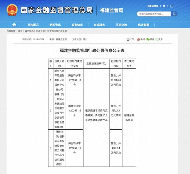 10月22日,国家金融监督管理总局福建金融监管局行政处罚信息公开表显示,新华人寿保险股份有限公 司福州中心支公司因银保渠道手续费列支不真实、委托医护人员销售健康保险产品,被警告,并处以 20.8万元罚款。同时,潘烽(时任新华人寿保险股份有限公司福州中心支公司银行业务部经理)因银保 渠道手续费列支不真实、委托医护人员销售健康保险产品,被警告,并处以4.1万元罚款;傅建伟(时 任新华人寿保险股份有限公司福州中心支公司副总经理)因银保渠道手续费列支不真实、委托医护人员 销售健康保险产品,被警告,并处以2.1万元罚款。 | 序 | 当事人名 | 行政处罚决定 | 主要违法违规行为 | 行政处罚 | 作出决定 | | --- | --- | --- | --- | --- | --- | | 름 | 称 | 书文号 | | 内容 | 机关 | | | 新华人寿 | | | | | | | 保险股份 | 闽金罚决字 | | 警告,并 | | | 1 | 有限公司 | (2025) 19 | | 处以20.8 | | | | 福州中心 | 를 | | 万元罚款 | | | | 支公司 | | | | | | | 潘烽(时 ...