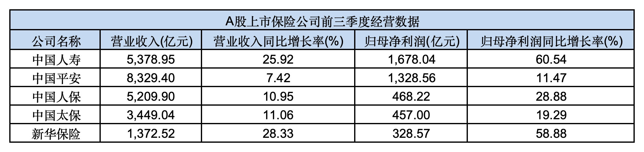 截至三季度末,五家保险机构合计营业收入为23739.81亿元,同比增长13.6%;合计归母净利润为4260.39亿元,同比增长33.54%,相当于日赚15.6亿元。 1、投资端爆发,三季度保险公司业绩狂飙 随着上市公司三季报全面披露,中国人寿、中国平安、中国人保、中国太保、新华保险这五大上市保险公司相继交出前三季度成绩单,其中利润端增长尤为 亮眼,五家险企归母净利润同比增幅均超两位数,最高达60.5%。 从盈利情况来看,凤凰网财经《投资观察》注意到,五家险企前三季度净利润均呈现大幅增长。中国人寿以1678.04亿元的归母净利润居首,同比增幅 60.54%同样拔得头筹;中国平安紧随其后,前三季度实现归母净利润1328.56亿元,同比增长11.47%;中国人保、中国太保分别实现净利润468.22亿元、457 亿元,同比增长28.88%、19.29%;新华保险为328.57亿元,增幅达58.88%。 | | | A股上市保险公司前三 | | --- | --- | --- | | 公司名称 | 营业收入(亿元) | 营业收入同比增长率(% | | 中国人寿 | 5,378.95 | 25.92 | | 中国平安 | ...