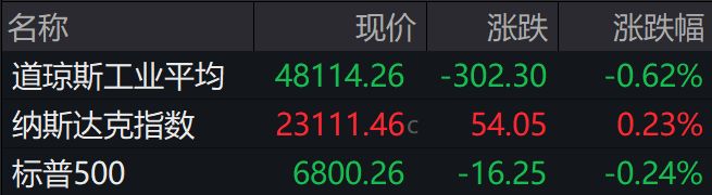 大宗商品市场中,国际油价大幅下跌。纽约商品交易所2026年1月交货的WTI原油期货下跌2.73%,收于 每桶55.27美元;布伦特原油2月合约下跌2.71%,报58.92美元。 【财经日历】 沐曦股份在科创板上市 2025小米"人车家全生态"合作伙伴大会(北京) | 名称 | 现价 | 涨跌 | 涨跌幅 | | --- | --- | --- | --- | | 道琼斯工业平均 | 48114.26 -302.30 | | -0.62% | | 纳斯达克指数 | 23111.46c | 54.05 | 0.23% | | 标普500 | 6800.26 | -16.25 | -0.24% | 当地时间周二,美股三大指数走势分化,截至收盘,道指跌0.62%,纳指涨0.23%,标普500指数跌 0.24%。 大型科技股涨跌不一。大型科技股走势分化。七巨头中,特斯拉上涨3.07%,创历史收盘新高;Meta上 涨1.49%,英伟达上涨0.81%;微软上涨0.33%;苹果上涨0.18%;亚马逊微涨0.01%。谷歌A股下跌 0.54%。博通上涨0.44%,甲骨文上涨2.02%。 中概股表现分化。阿里巴巴下跌0.53%,拼 ...