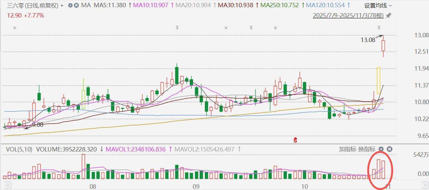 另外,10月28日,武汉人工智能创新应用示范基地项目(一期)中标结果正式公布,三六零数字安全科技 集团有限公司以1.32亿元成功中标。据梳理,近期三六零在人工智能领域连续斩获多个来自B端客户的 大订单。仅今年10月,三六零该业务线在AI相关项目上中标的累计金额超3亿元。 格隆汇11月3日|继上周五涨停后,三六零(601360.SH)今日盘中再度拉升,涨超9%,逼近涨停报13.08 元,股价创2月14日以来新高。从三六零近期走势来看,该股已连续11日上涨,且在最近三个交易日涨 幅扩大的同时,成交额也明显放大。 消息面上,公司此前公布的业绩显示,2025年第三季度营收22.4亿元,同比增长16.88%;净利1.6亿 元,扣非后净利1.59亿元。 ...