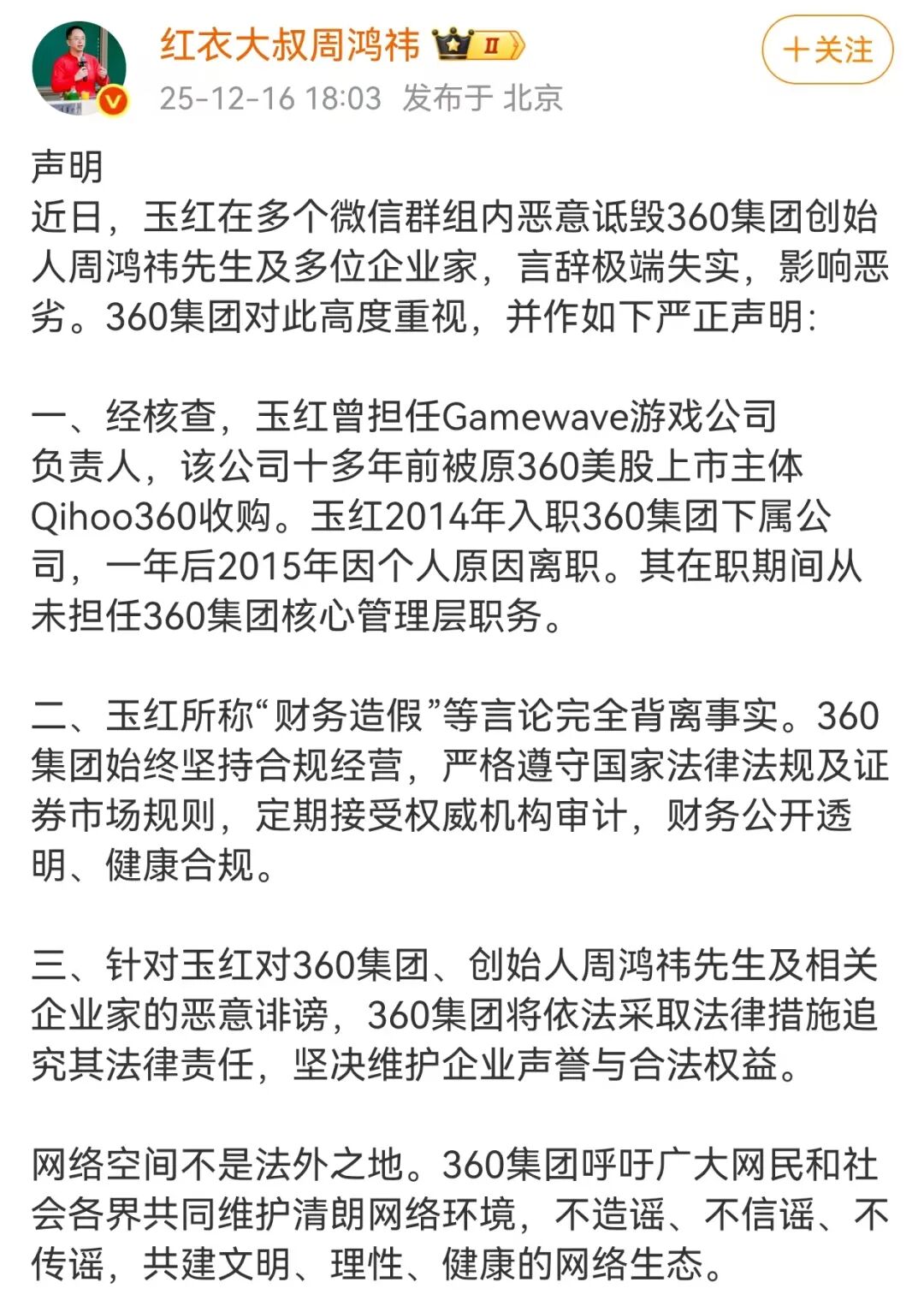 12月16日晚,360集团创始人周鸿祎在个人微博发布声明: 近日,玉红在多个微信群组内恶意诋毁360集团创始人周鸿祎先生及多位企业家,言辞极端失实,影响恶劣。360集团对此高度重视,并作 如下严正声明: 12月16日,据网传截图,前360高级副总裁、三点钟社群核心发起人玉红,在朋友圈和多个群聊中对周鸿祎进行"攻击"。玉红在群聊中表 示:"我帮周鸿祎做假账就至少几十亿的,我都有数据。我会全网公布,他的游戏全部财务造假。"其还在群内强调自己没有被盗号。 一、经核查,玉红曾担任Gamewave游戏公司负责人,该公司十多年前被原360美股上市主体Qihoo360收购。玉红2014年入职360集团下属 公司,一年后2015年因个人原因离职。其在职期间从未担任360集团核心管理层职务。 二、玉红所称"财务造假"等言论完全背离事实。360集团始终坚持合规经营,严格遵守国家法律法规及证券市场规则,定期接受权威机构 审计,财务公开透明、健康合规。 三、针对玉红对360集团、创始人周鸿祎先生及相关企业家的恶意诽谤,360集团将依法采取法律措施追究其法律责任,坚决维护企业声誉 与合法权益。 网络空间不是法外之地。360集团呼吁广大 ...