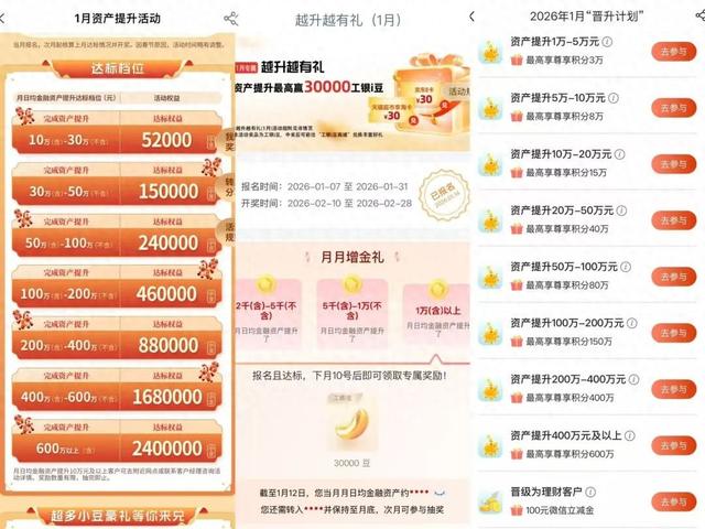 开年以来,多家银行推出资产提升营销活动,类似"资产提升礼,哪家银行力度强?攻略来了!"的帖子也在社交平台上迅速走红,吸引了不少网友在评论 区交流经验。 这场看似热闹的"撒红包"活动背后,是银行业在净息差持续收窄背景下,从传统存款考核转向以AUM(零售客户总资产)为核心的财富管理竞争的缩 影。然而,靠奖励吸引来的资金,常陷入"有流量、无留量"的短期营销困局,又当如何破解? 银行开年频出招 花式奖励吸引客户 1月以来,工商银行(601398)、农业银行(601288)、中国银行(601988)、北京银行(601169)、北京农商银行等多家银行推出"资产提升享好礼"等 营销活动,希望通过丰厚奖励吸引客户将资金存入自家银行。 资产提升营销活动: 即客户在银行的月日均金融总资产较上月提升一定额度,就能领取高额积分,兑换各类实物礼品、餐饮代金券、微信立减金,乃至生活服务权益。 "银行不再仅仅关注存款规模,而是更加重视零售AUM。"某国有行个金部人士告诉记者,以AUM为核心的考核体系,意味着银行需要吸引客户将更多资 金配置在自家平台上的存款、理财、基金、保险等多元化产品上,实现资金的长期沉淀。 图片来源:工商银行App 据 ...