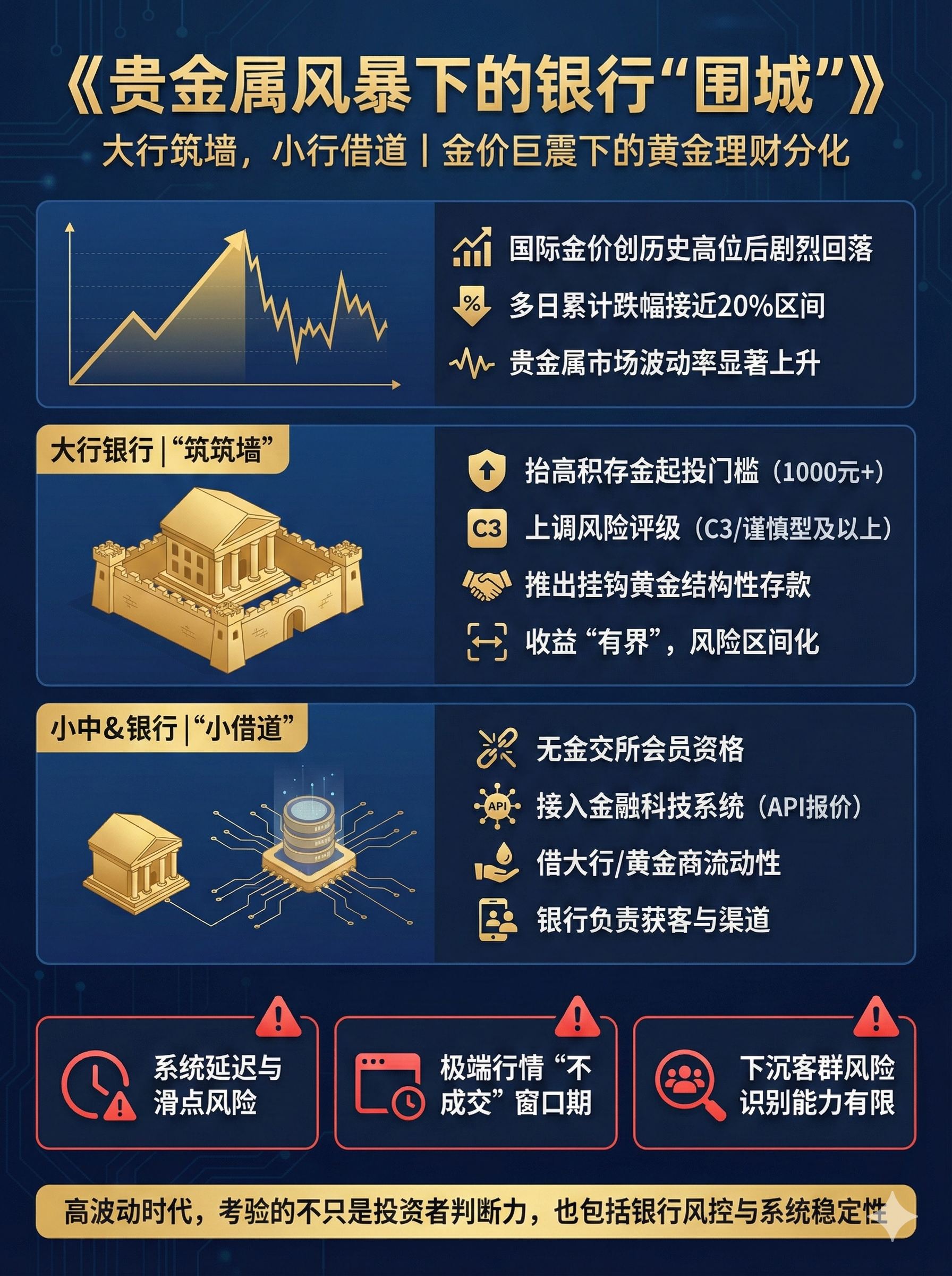 年终奖即将到手的律师王植(化名),在二月初的寒意中感到了某种难言的燥热。那是金价巨震带给市场的余温,也是财富焦虑在特定节点下的投射。 2月2日,全球贵金属市场遭遇深幅回调,此前一度冲破5500美元/盎司大关的现货黄金,在短短数个交易日内掉头向下,多日累计跌幅接近20%区间。 尽管市场弥漫着对"史诗级暴跌"的恐慌,但对于王植而言,波动即是磁石——他既不甘心在这一轮黄金热潮中彻底缺位,又对当前高位的剧烈波动心存忌 惮,最终在多家大型银行推出的黄金挂钩结构性存款前,停下了目光。 这并非王植一个人的选择。 随着大量存款到期与年终奖发放季重合,在黄金行情余温尚存的背景下,各类挂钩贵金属的理财产品正成为银行获客揽储的"胜负手"。 在这场全民淘金热中,大型银行与中小型银行对于黄金业务的态度,正在呈现出微妙的分化: 一边是努力"降温"的国股行,正通过抬高门槛、强化风险评级来构筑防火墙; 一边是仍在"升温"的中小银行,试图在技术与渠道的缝隙中,借道分享这场盛宴。 大行"筑墙" 在金价立于高位、波动率放大的背景下,国有大行与头部股份制银行正悄然掀起一场"去散户"的运动; 这种策略并非拒绝客户,而是通过提高准入门槛与设计风险对冲产 ...