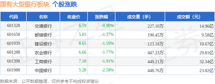 | 代码 | 名称 | 主力净流入 (元) | 主力净占比 游资净流入 (元) | | 游资净占比 散户净流入 (元) | | 散户净占比 | | --- | --- | --- | --- | --- | --- | --- | --- | | 601328 交通银行 | | 6691.67万 | 4.47% | -5627.93万 | -3.76% | -1063.74万 | -0.71% | | 601939 建设银行 | | -2547.18万 | -2.39% | 5019.38万 | 4.71% | -2472.21万 | -2.32% | | 601658 邮储银行 | | -3853.57万 | -4.02% | 5012.98万 | 5.23% | --1159.41万 | -1.21% | | 601988 中国银行 | | -2.16 Z | -9.06% | 1.28亿 | 5.39% | 8757.12万 | 3.68% | | 601398 工商银行 | | -2.44亿 | -7.54% | 8495.26万 | 2.63% | 1.59亿 | 4.91% | | 601288 ...